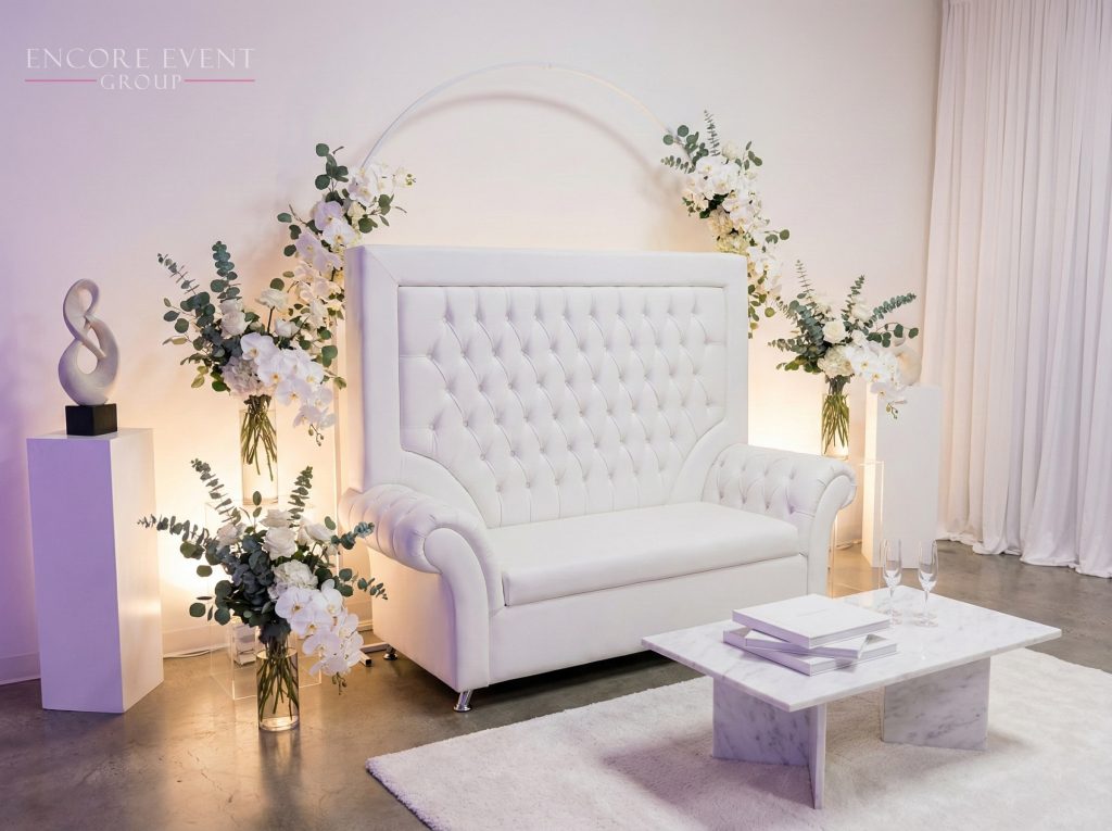 Place lounge couches near cocktail bars, floral champagne walls, patios, or a white dance floor to encourage guest interaction without crowding.