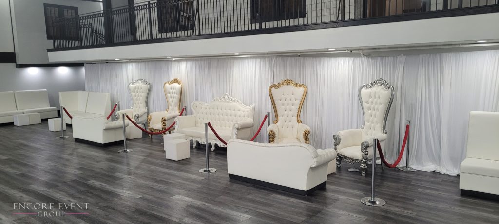 Our weddings lounge rentals includes white leather seating, throne chairs, and modular sectionals designed for event conversation areas.