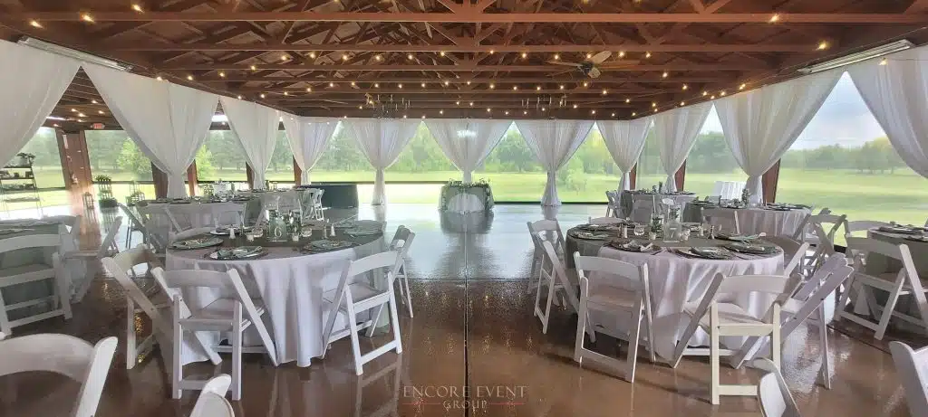 Many clients bundle tent ceiling décor with other Encore rental services, including dance floor lighting that moves.