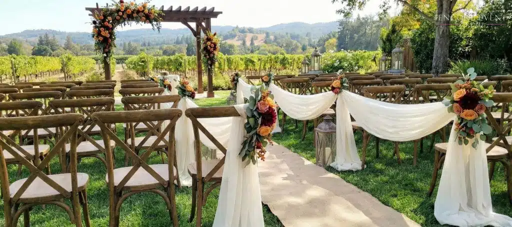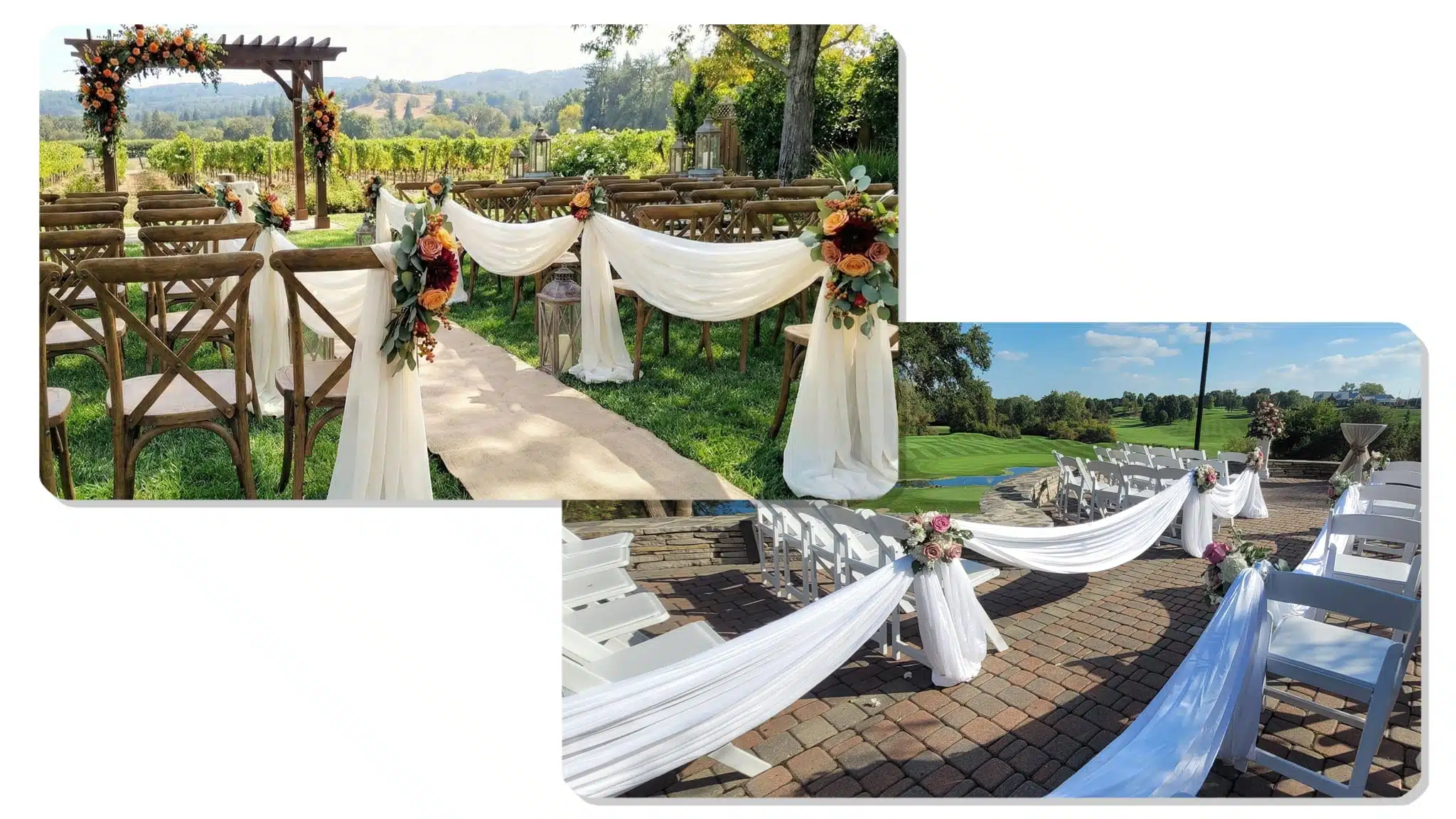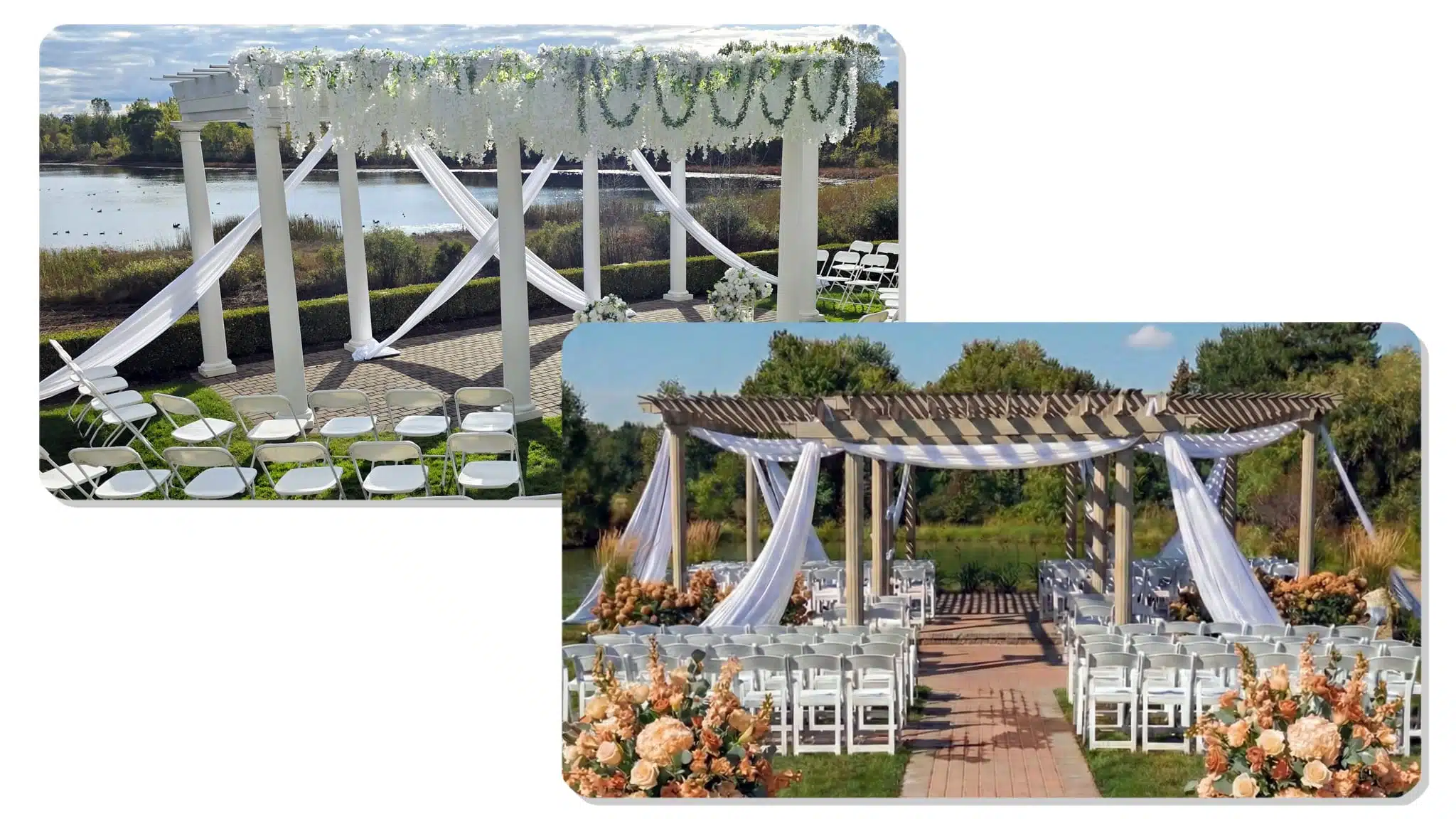 We regularly drape ceremony pavilions, pergolas, & gazebos. These spaces photograph beautifully with soft fabric.