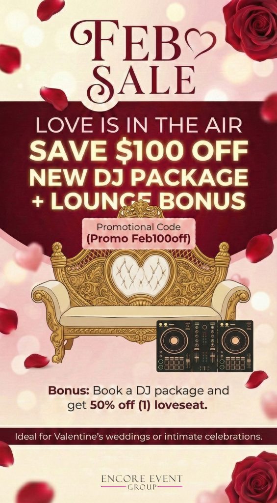 Lock in your dream wedding or event with this month’s exclusive savings! Our monthly promotions give you the best value on DJs, photo booths, lighting & event enhancements. Don’t wait — promotions are valid only during the current month & availability is limited.