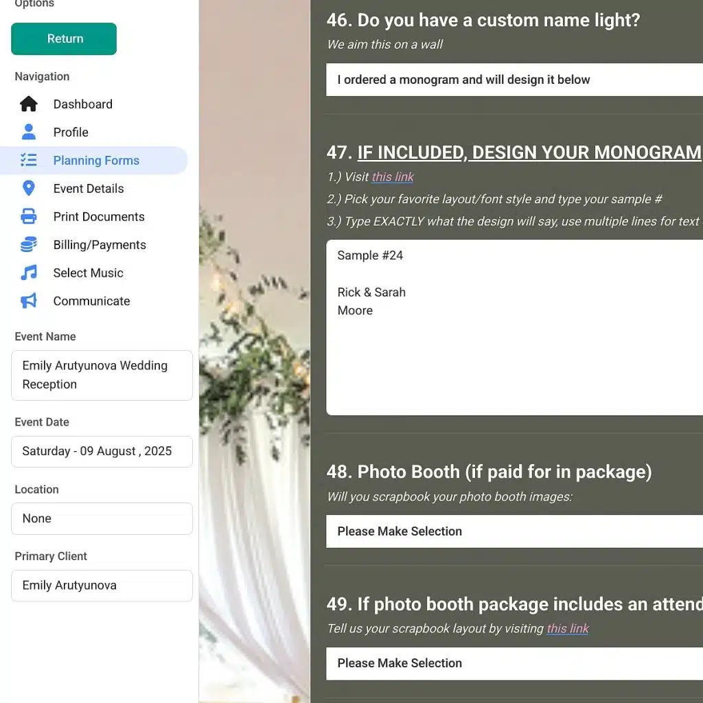 “Let me just say OMG! He really knows how to bring a reception hall together, with the exact theme we wanted! Oh, and I can’t forget to mention his DJ service, pattern lighting, decorative floral arrangements, indoor fireworks, and dancing-on-a-cloud skills. He absolutely rocked our wedding reception, in every way possible.”