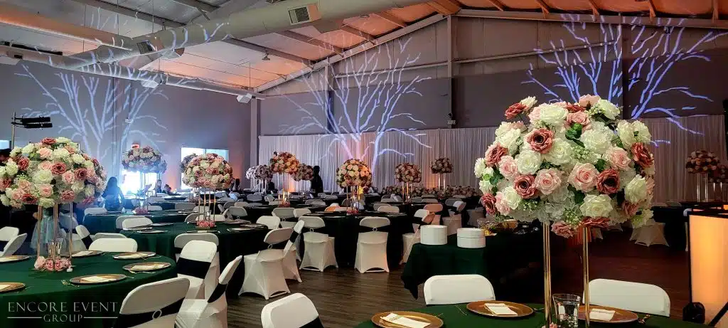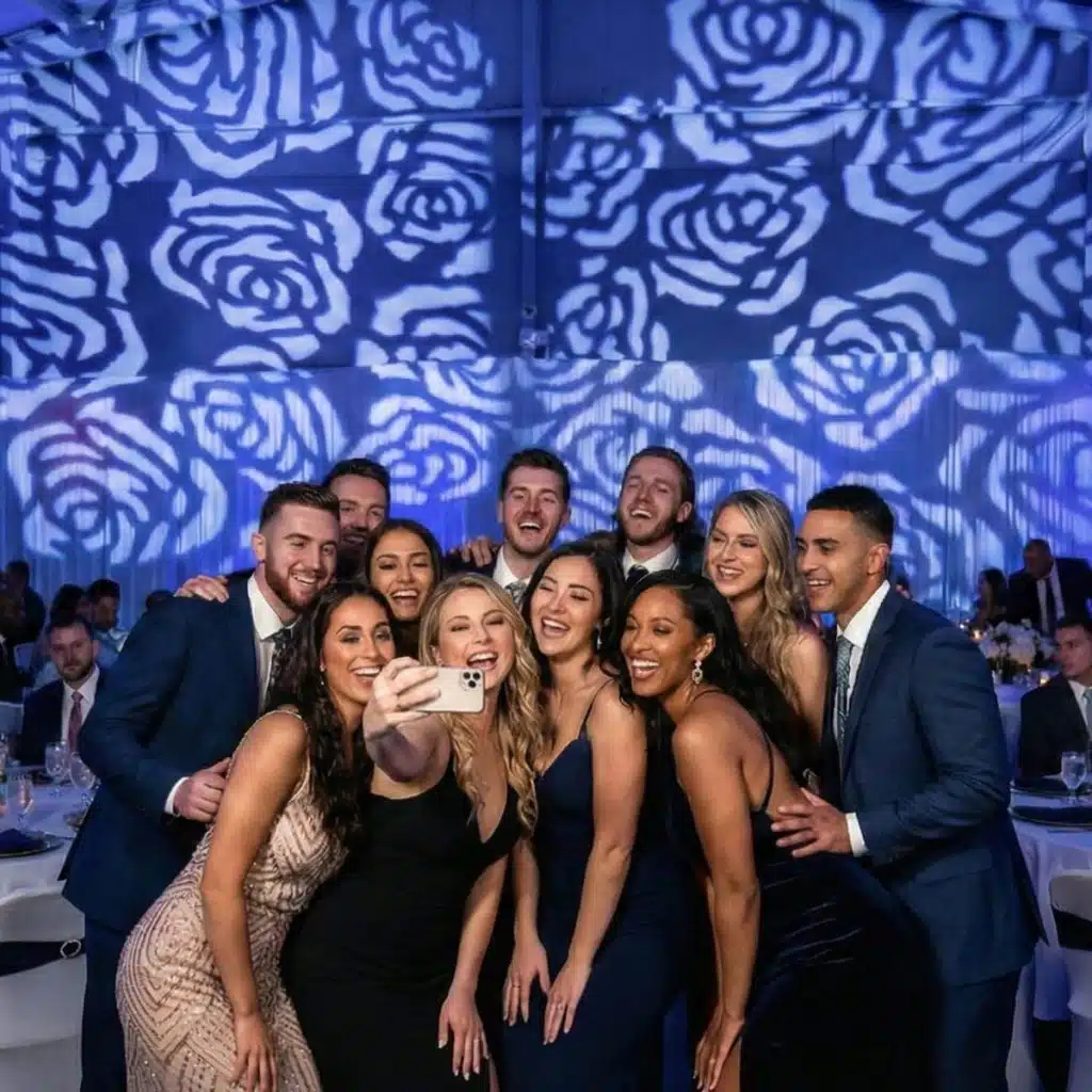 For a layered, photogenic design, pair your gobos with uplighting, intelligent movers, Clarksville flower garlands, or New Albany ceiling drapery.