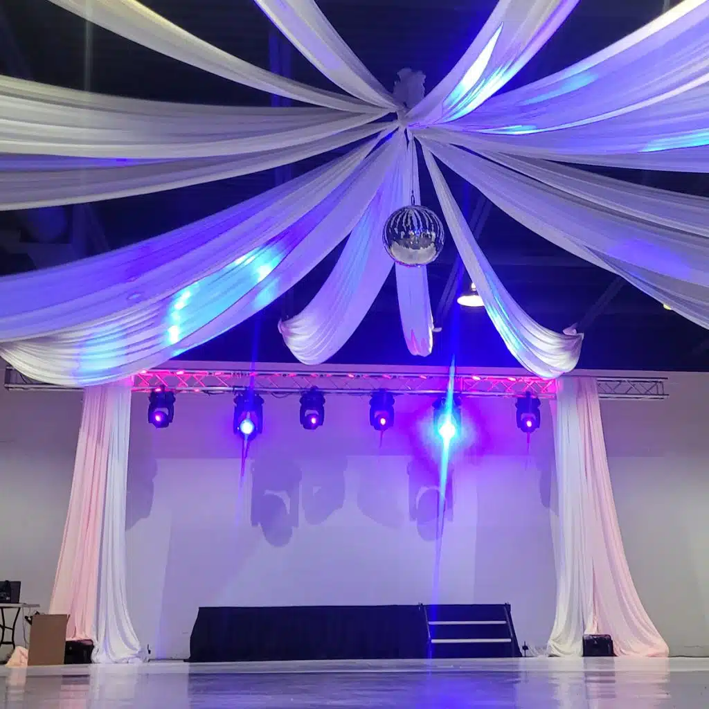 Most receptions use 4 movers on 7-ft trussing. Larger venues may use 8–12, and extremely large public events may require 20+ for full coverage.
