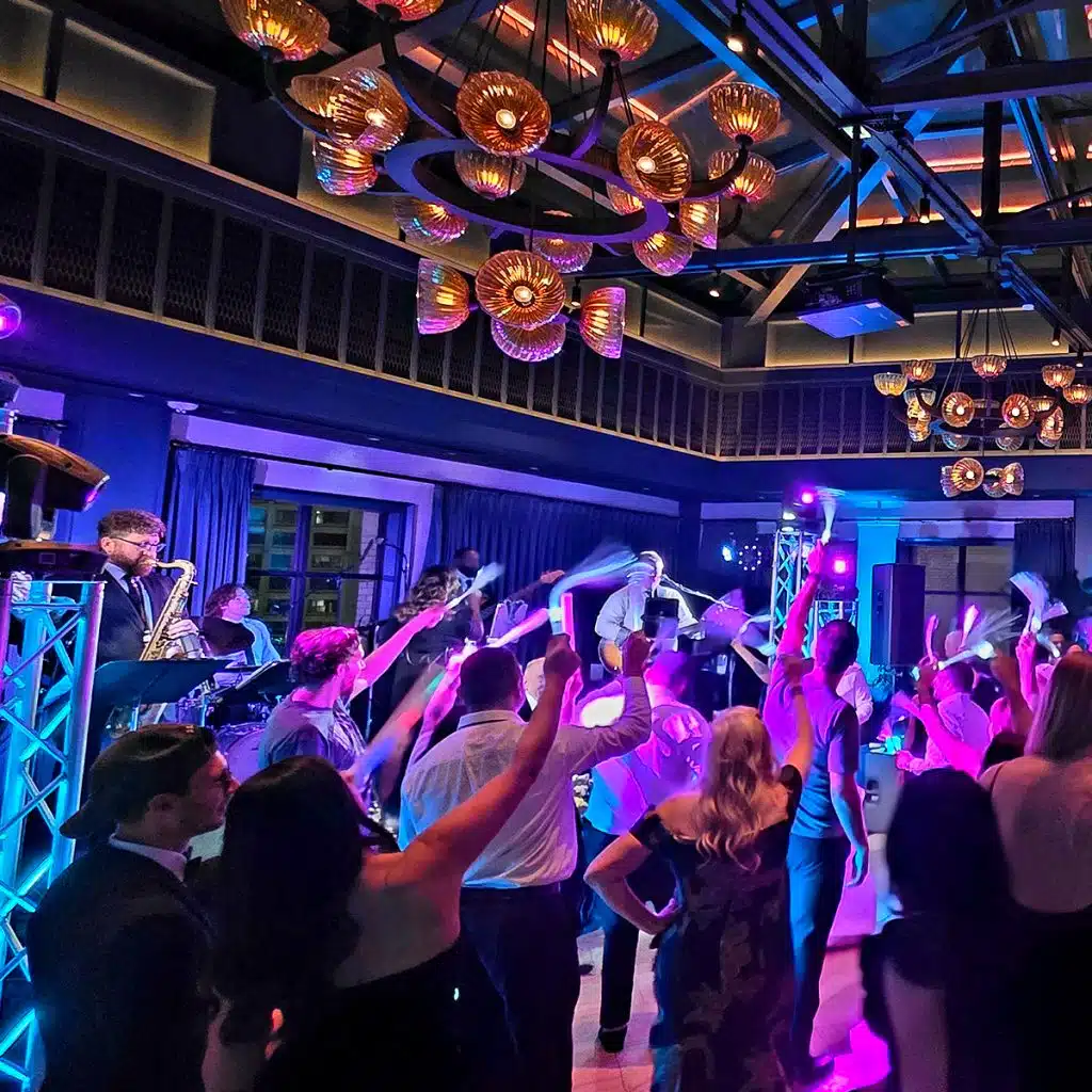 Ceiling washes can be layered with ambient lighting to create depth & dynamic color effects throughout the venue. Our dance floor light show enhances photography and videography with natural lens flares, and all movements can sync with your DJ or live band for maximum energy.