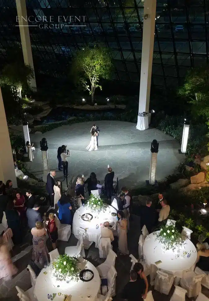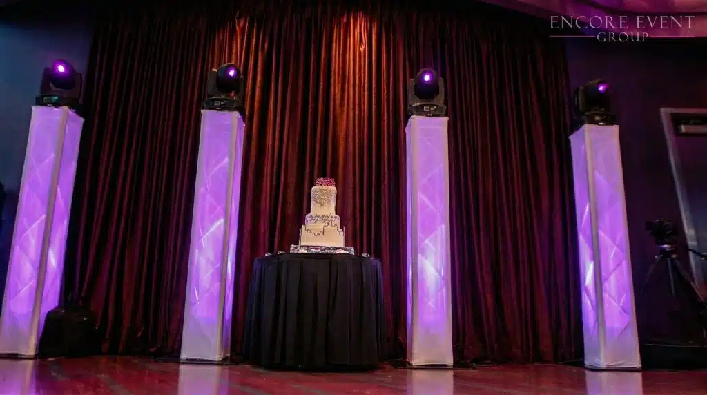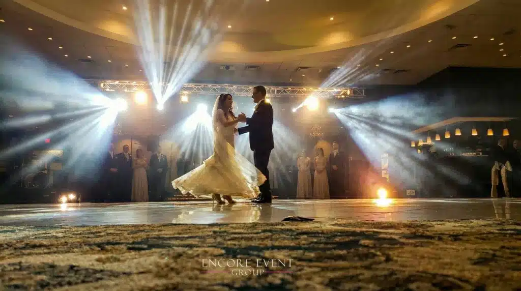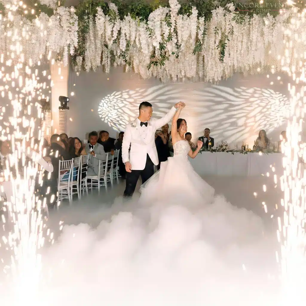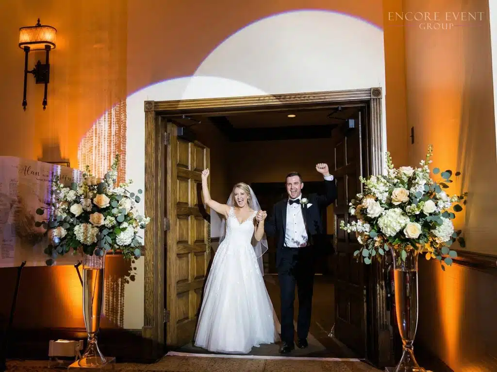 Pair with our professional wedding DJs, or control them independently with your live band. Add Encore wedding chandeliers, floral walls, or a flower champagne wall for a fully immersive look.