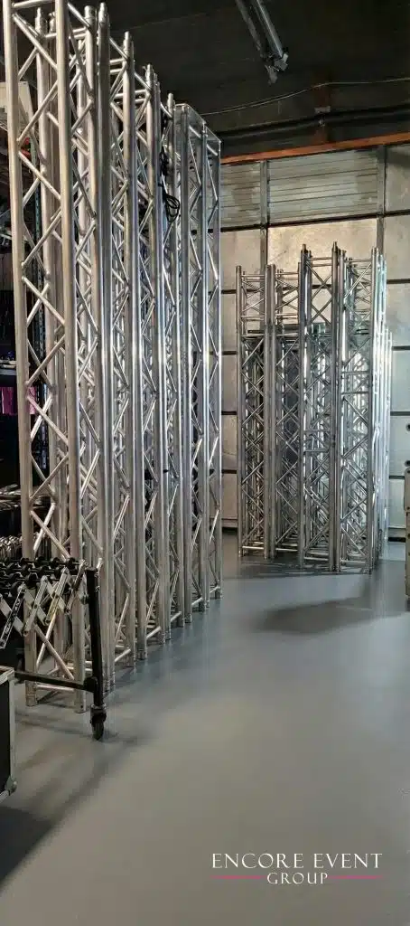 Larger concert-style events use 20–30 ft horizontal trusses with hydraulic crank stands.