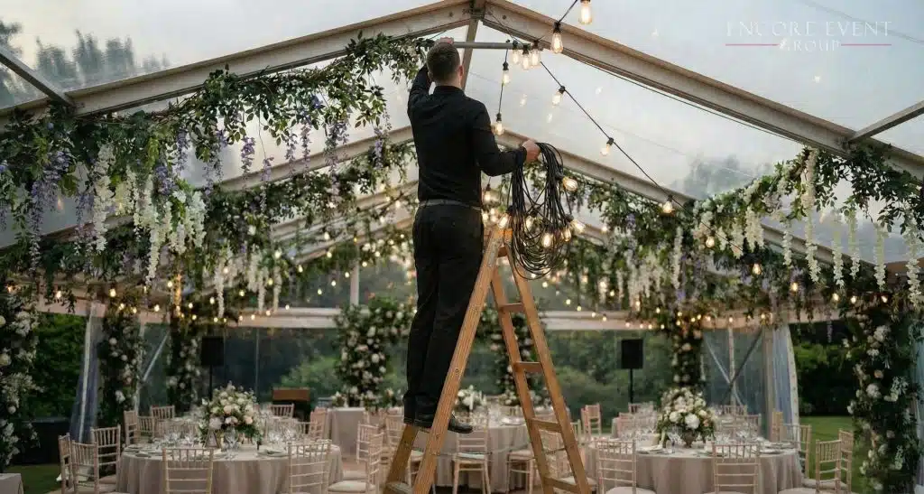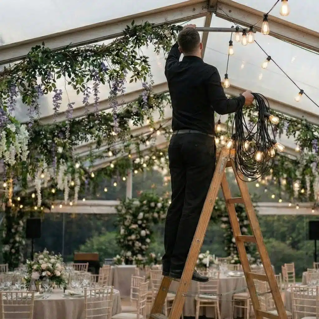 We install on trees, tents, rafters, balconies, and freestanding structures that are hidden with draping. Each layout is planned for safety, spacing, and visual balance.