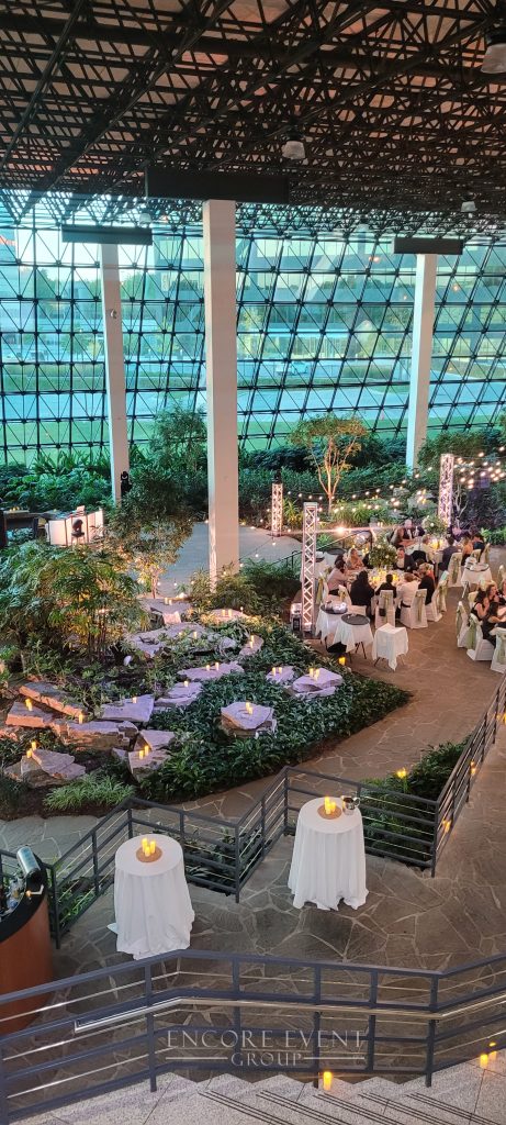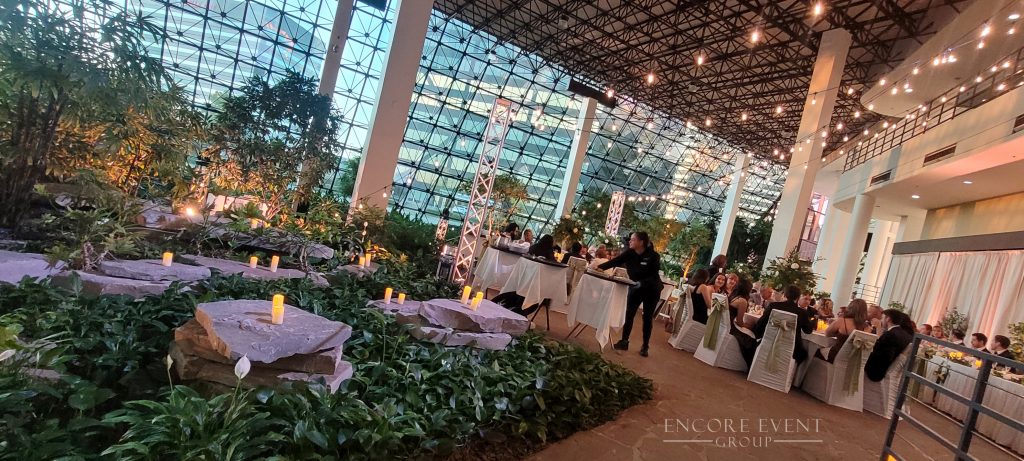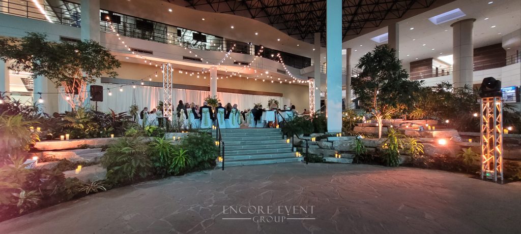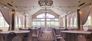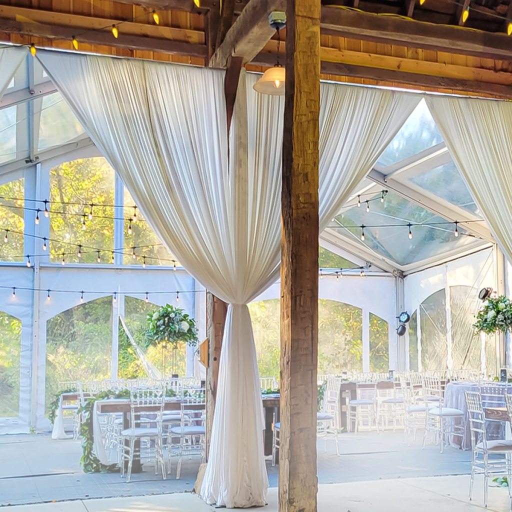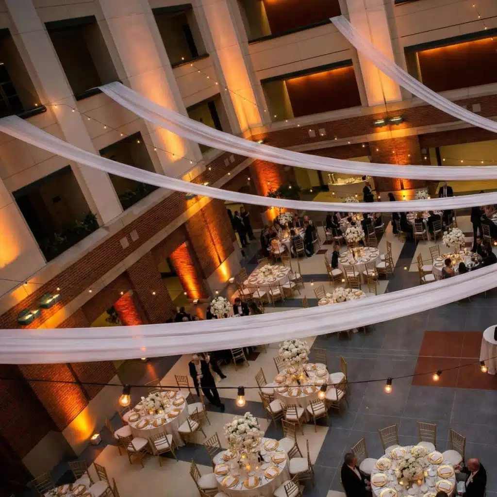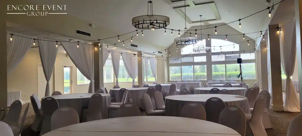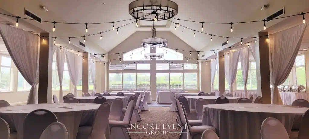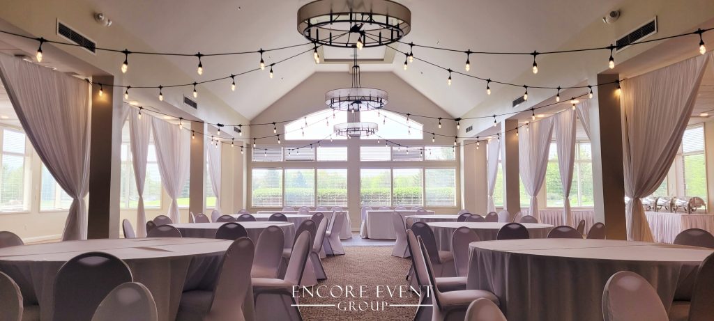 Indoor installs add warmth and visually lower high ceilings. Want an affordable solution? These are available for rent at our Indiana banquet hall.