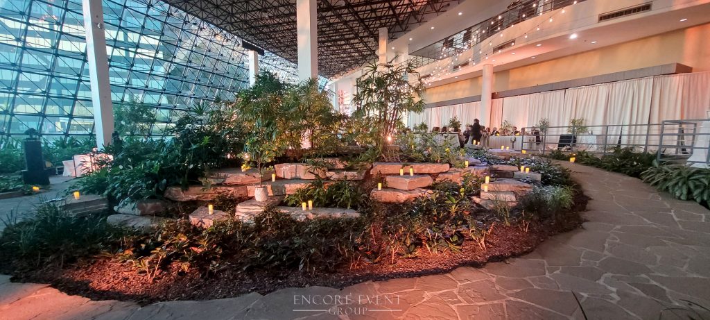 We factor in depth of decorations. For example, the string lights are higher up than white flower arch rental and this creates a layered look.