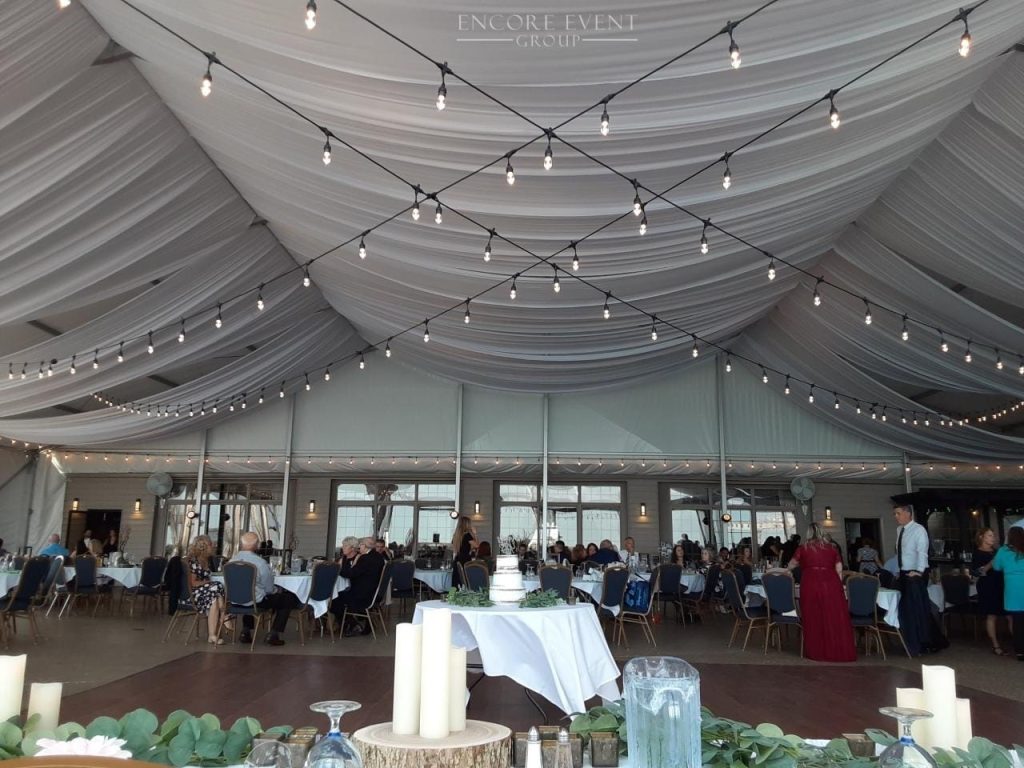 Our technicians suspend edison string lights in trees, tents, rafters, & freestanding trusses hidden with drapes. All rentals are planned for spacing, safety & visual balance.