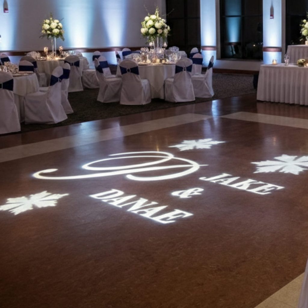 We use premium LED fixtures with crisp focus, adjustable zoom, and high output. Our wedding gobos make photography-friendly lighting.