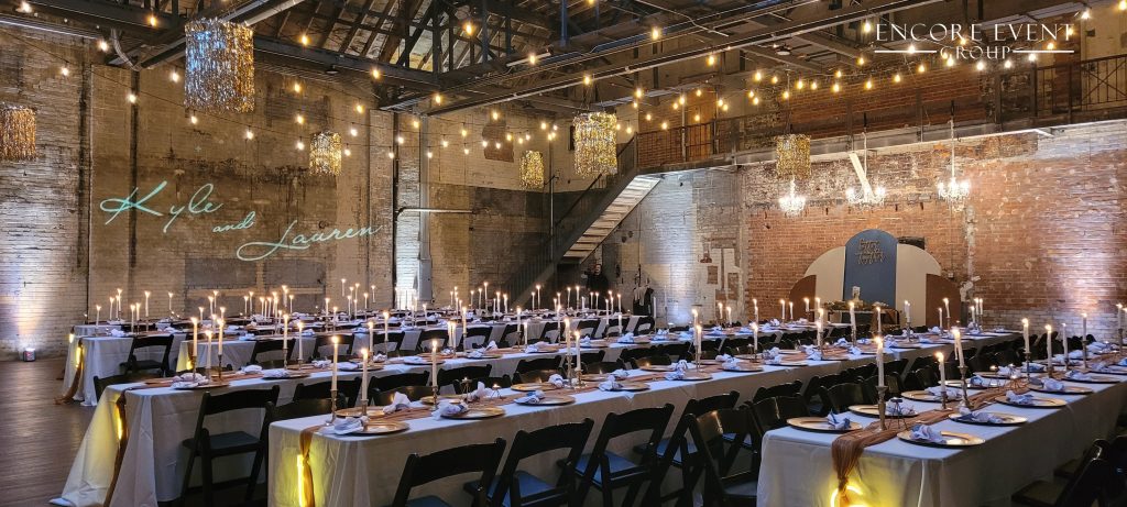 We design custom gobos, projecting your design in barns & ballrooms, and help you create a signature “WOW” moment when guests walk in.