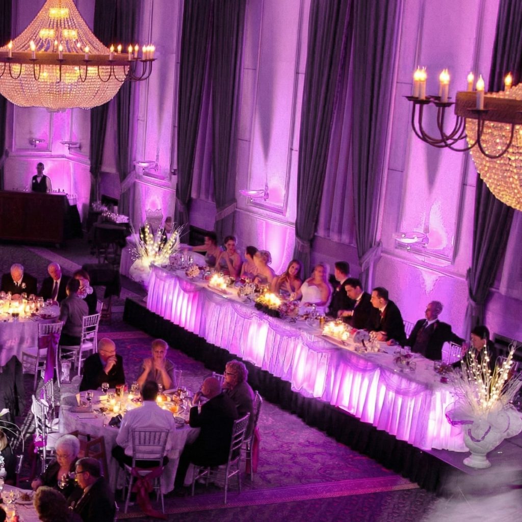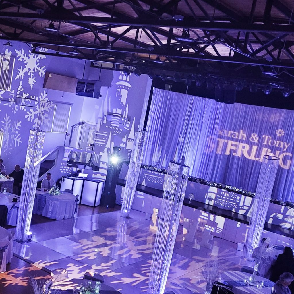 Pair your LED wedding lighting with our disc jockey packages for a fully coordinated reception. Add intelligent moving heads for spotlight moments and smooth color-shifting effects throughout your banquet hall.